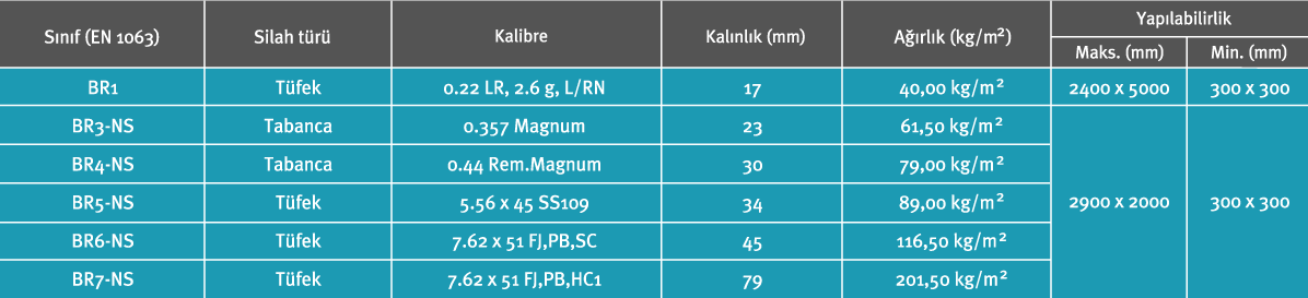 Kurşun geçirmez camlar EN1063 standartına göre üretilen ve silahlı saldırılara karşı koruma sağlayan çok katlı laminasyon üniteleridir. Gerektiğinde cam katları temperli olarak kullanılabilir. EN1063 standartında yer alan NS sınıfına göre iç tarafa doğru cam parçacıkların dağılımı engellemek için polikarbon levha uygulamalı olarak da üretilmektedir.