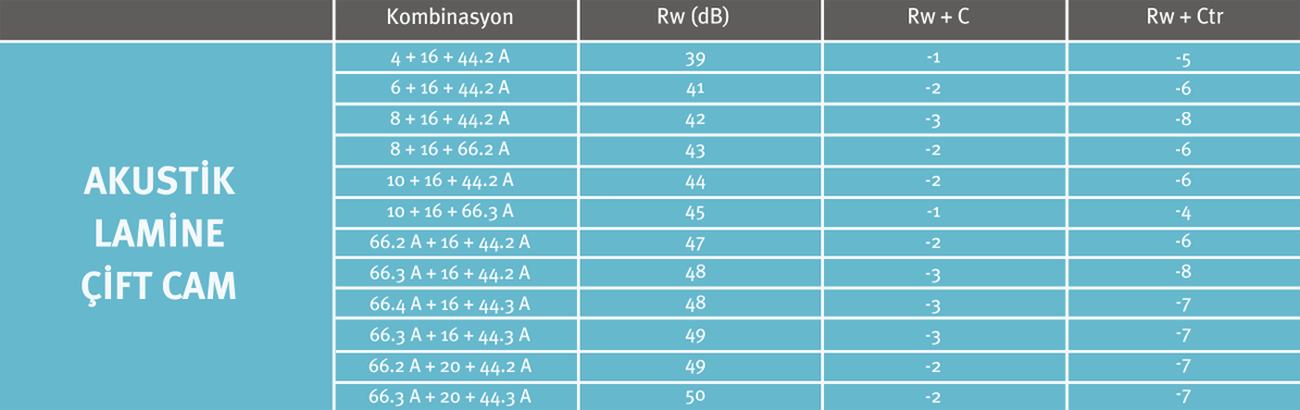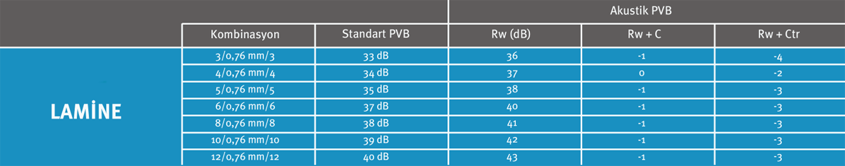 Standart PVB tabakalı lamine camile Akustik PVB tabakalı lamine cam karşılaştırmalı ses yalıtım tablosu ile çift cam ünitelerinde tek taraflı veya çift taraflı akustik lamine cam kullanımında ulaşılan ses yalıtım tablosu aşağıda verilmiştir.